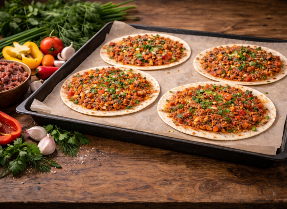 - Подавать лахмаджун можно по-разному: свернуть в трубочку, сложить пополам или дополнить свежими овощами и зеленью. Блюдо подходит как для быстрого ужина, так и для перекуса.
