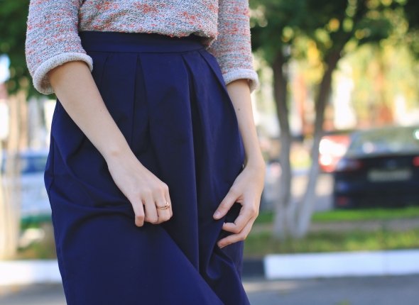 Так называются модели с расширением от талии или от середины бедра, нередко выполненные на кокетке. Сюда же относится и юбка-татьянка. Носить юбку-клеш можно с удлиненным приталенным жакетом либо принтованной блузой, а также с джинсовым жакетом или жилетом. Такой верх удерживает силуэт, не дает юбке "расплываться" визуально и делает образ более собранным и современным.
