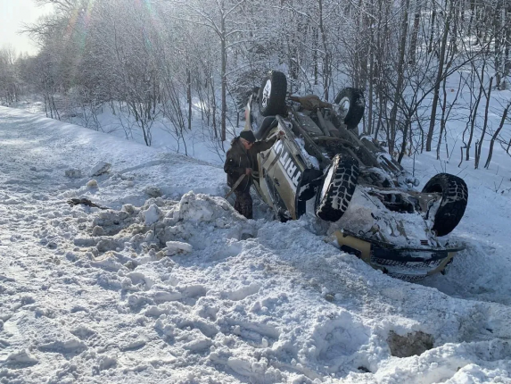 Внедорожник перевернулся на крышу из-за ДТП в Анивском районе. Фото: пресс-служба агентства по делам ГО, ЧС и ПБ Сахалинской области.