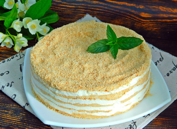 - Печенье измельчите в мелкую крошку любым удобным способом — в блендере, мясорубке или просто скалкой. Чем мельче крошка, тем нежнее получится торт.