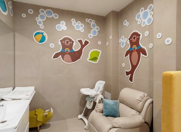 Небольшое, но продуманное пространство оборудовали мягкой мебелью и удобным креслом-качалкой для кормления. Есть высокий стул для малыша и две раковины: обычная для взрослых и заниженная — специально для юных пассажиров. В комнате установили кулер с горячей и охлажденной водой, пеленальный стол с мягким матрасом. На полках всегда есть одноразовые пеленки, влажные и сухие салфетки. Для кормления предусмотрены подогреватели детских бутылочек, а также компактный дорожный горшок со сменными пакетами.