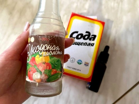 Речь идёт о смеси уксуса, соды и йода, которая помогает справиться с налётом и вернуть блеск унитазу.