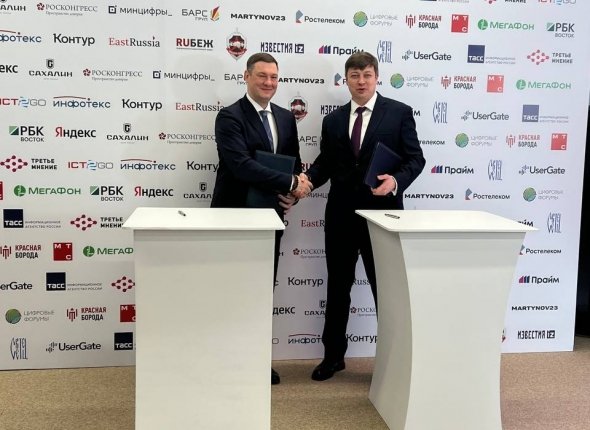 Подписи в документе поставили начальник Департамента цифрового развития региона Бари Хаиров и директор по развитию корпоративного бизнеса МегаФона в Сибири и на Дальнем Востоке Артём Базыль на площадке международного форума "Цифровой маяк. Управление на основе данных" в Южно-Сахалинске.