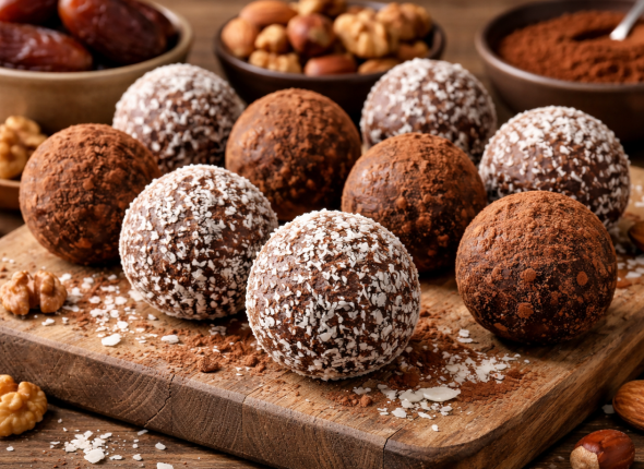 Основой таких сладостей служат финики — натуральный источник сладости и энергии. В сочетании с орехами они дают плотную текстуру и обеспечивают организм полезными жирами. Дополнительный вкус и аромат придаёт какао, а щепотка соли усиливает сладость и делает вкус более сбалансированным.