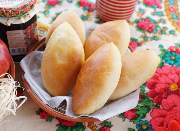 Классический вариант — картофель, капуста или мясо, но подойдут и сладкие начинки. Пирожки слегка приплющивают и обжаривают в разогретом масле до румяной корочки.