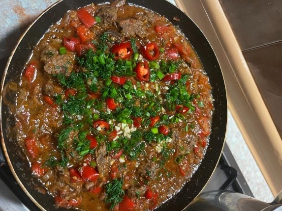 Лук, морковь и болгарский перец измельчают и обжаривают в глубокой сковороде на растительном масле до мягкости. Затем добавляют мелко нарезанные помидоры, чайную ложку хмели-сунели, столько же паприки и соль по вкусу. Всё вместе готовят еще около семи минут.
