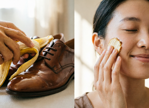 Возьмите свежую банановую кожуру и с легким нажимом проведите по всей поверхности обуви её внутренней частью. Натуральные масла, содержащиеся в кожуре, напитают кожу и придадут ей мягкий блеск. Эффект будет сравним с дорогим кремом. После обработки протрите обувь сухой мягкой тканью до сияния.