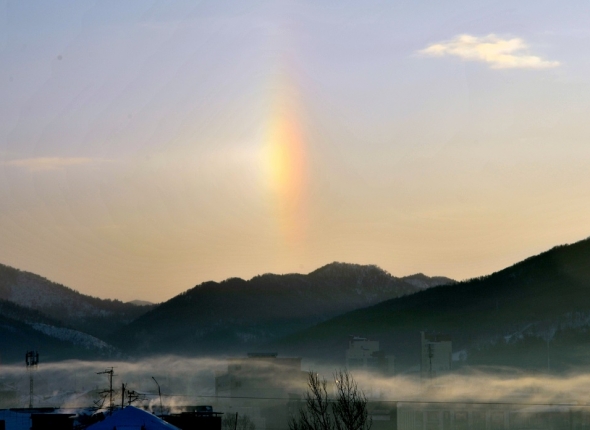 Ясная тихая морозная погода, помимо традиционного смога, породила редкое небесное явление гало – небольшие зимние радуги вокруг солнца. Высокая влажность и сильный мороз способствовали появлению в воздухе ледяных кристаллов, в которых преломились лучи восходящего солнца.