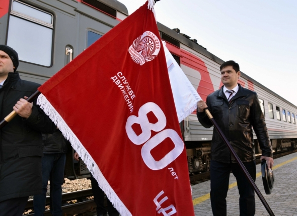 Справка: В 1936 году в Наркоме путей сообщения СССР было организовано Управление движения. В честь этого события, РЖД запускает эстафету флага "80 лет службе движения" по всей России, от островной станции Ноглики до Калининграда.