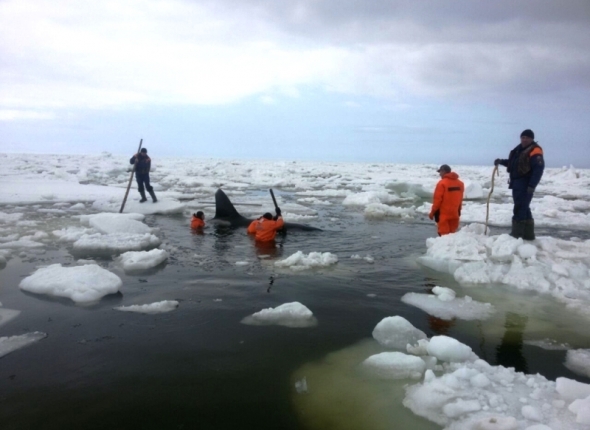 Четыре косатки попали в ледяную западню в Охотском море в районе села Стародубское