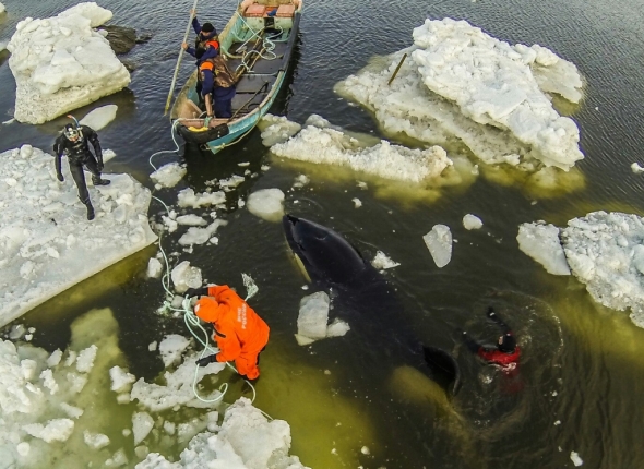 Сахалинские спасатели продолжают бороться за жизнь зажатых во льдах Охотского моря косаток