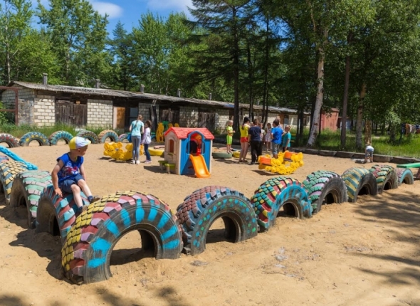 Дарья Рогач, жительница пгт. Ноглики: "Побольше бы таких площадок в Ногликах, на нашей улице примерно сорок малышей и детям ведь негде играть – за развлечениями приходится везти детей в центр. Поэтому мы сами во дворе поставили эту площадку, все красили, скидывались деньгами, колеса эти покупали".