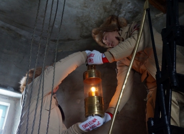 На этом церемония не закончилась, юнармейцы с вершины маяка спустили лампаду вниз. Сделать это было непросто, так как винтовые лестницы этого сооружения очень неудобны. Лампаду с вершины маяка передали юнармейке Вите Вон из Южно-Сахалинска, которая спустилась с лампадой по винтовой лестнице и перед зданием маяка торжественно передала лампаду спортсмену-военнослужащему Никите Хаяну.