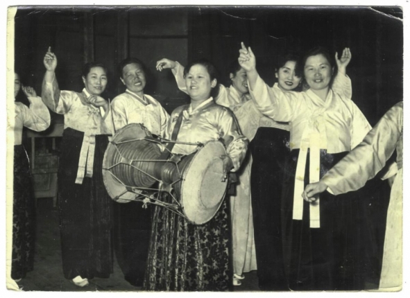 Участницы корейского народного театра в 1961 году с национальным инструментом "дянгу" (барабан)